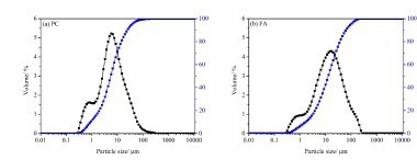 Using FA as SCMs in concrete engineering is one of the main ways of making highly efficient use of FA. This not only reduces the consumption of natural resources but also has advantages that other materials cannot replicate in meeting the requirements of green concrete. The advantages of FA can be summarized as follows: firstly, FA microspheres assist the advantageous distribution of cement particles and can clearly accelerate cement hydration and reduce the water/cement ratio for the same fluidity [3]. Secondly, the secondary hydration reaction of FA occurs mainly in the pores and consumes a great deal of CH, which reduces the pore volume of the cement matrix and substantially increases the compactness and durability of the cement-based materials [4]. Thirdly, any FA that does not take part in the pozzolanic reaction acts as micro-aggregate and fills the voids between the aggregate particles, thereby further improving the density of the concrete [5]. FA also can delay the rate of cement hydration, which lowers the rise in concrete temperature caused by the heat of hydration and avoids the generation of cracks [6-9].