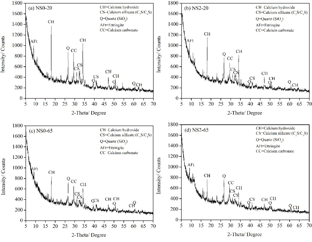It is obvious that, when compared to the samples NS0-20, there is a clear decline in porosity in the sequence: NS0-20 > NS3-20 > NS0-65 > NS3-65, due either to the addition of NS or the increasing curing temperature. Furthermore, it is clear that the addition of NS and increasing the curing temperature increases the quantity of harmless pores, mainly because NS and steam curing can promote the hydration reactions of cement clinker and enhance the activity of fly ash, thereby accelerating the secondary hydration reaction of CHVFA paste. This would produce more hydrated calcium silicate and hydrated calcium aluminium gel, causing a large increase in gel pores. Table 3 also shows that for samples with added NS, steam curing can increase the amount of harmful pores and more-harmful pores, and also the average pore diameter. The specific reasons for this can be summarized as follows: firstly, high temperatures can accelerate the migration of water within cement-based materials, causing large quantities of connecting holes; secondly, although increasing temperature would accelerate the hydration process of cementitious materials, the crystalline hydration products are usually bulky and unevenly distributed, which causes more pores to be formed. It can therefore be concluded that the addition of NS makes the pore structures shift from harmful, more-harmful and less-harmful ones to harmless ones. While increasing the curing temperature increases the less-harmful, harmful and more-harmful pores and decreases the harmless ones.