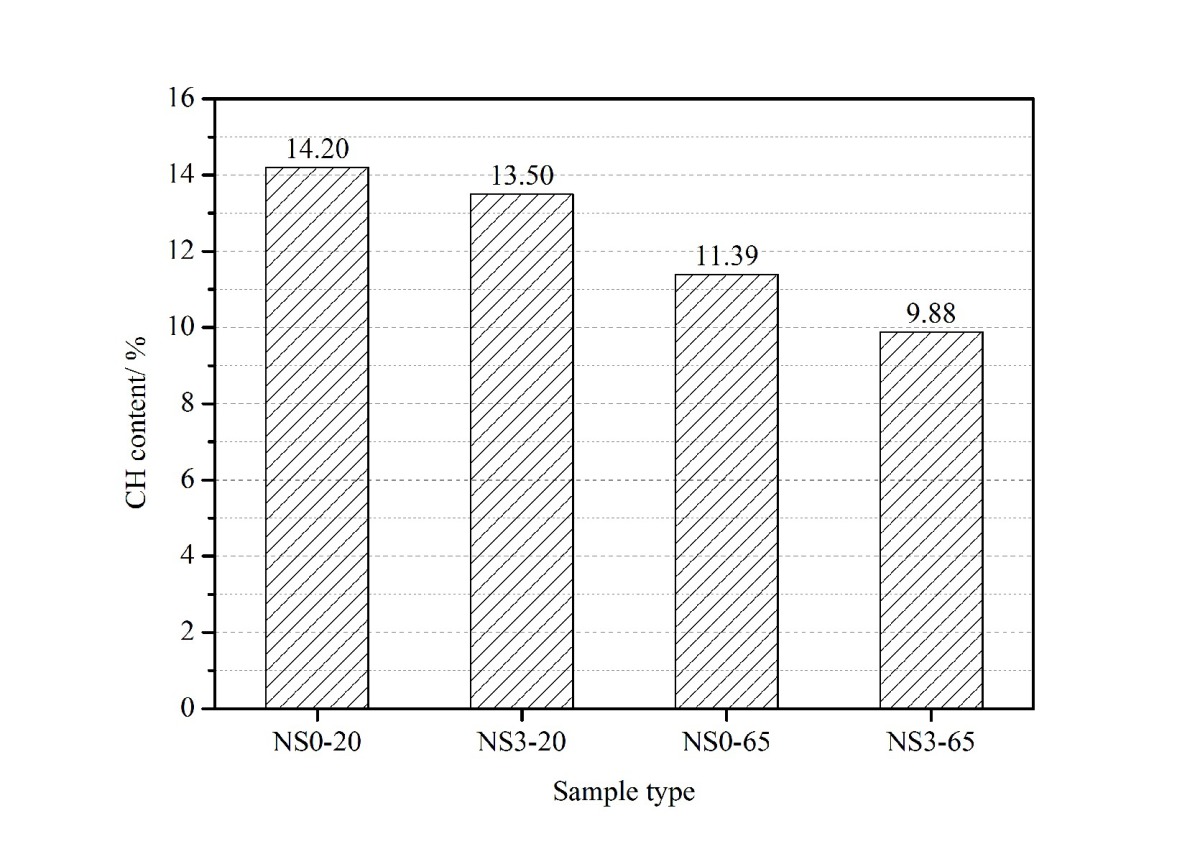 As indicated by the bar graph, the sequence of CH content from high to low is as follows: NS0-20 > NS3-20 > NS0-65 > NS3-65, which is in agreement with the results of the XRD. Most interestingly, the addition of 3 % NS at 20 °C lowers the CH content by 0.7 % (from 14.20 % to 13.50 %) but when steam curing is used the addition of 3 % NS lowers the CH content by 1.51 % (from 11.39 % to 9.88 %), showing that NS promotes the pozzolanic reaction for consumption of CH more readily at the higher temperature. For samples without any NS the use of steam curing only decreases the CH content by 2.81 % (from 14.20 % to 11.39 %), while for samples containing 3 % NS the CH content is decreased by 3.62 % (from 13.50 % to 9.88 %) when steam curing is used, suggesting that steam curing can promote the pozzolanic reaction more effectively in the presence of NS. All this confirms the existence of a synergistic effect between curing temperature and NS on the pozzolanic reaction in CHVFA systems.