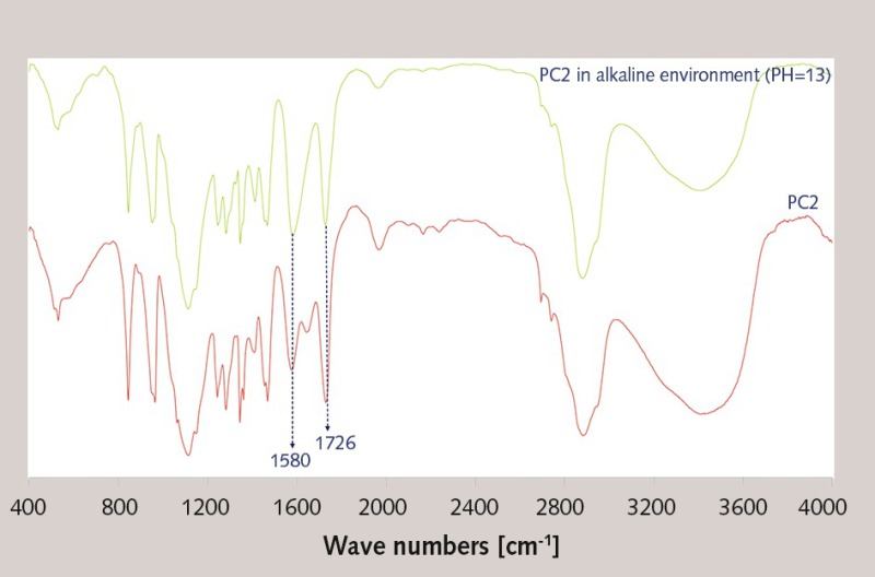 The FTIR spectra of PC2 and PC2 under the alkaline condition (pH = 13) can be seen in the Figure 3. From the figure, the peak for ester group (-COOCH2-, 1726 cm-1) is reduced and the peak for sodium carboxylate (-COONa, 1580 cm-1) is increased, which illustrates that the ester group has been decomposed into the carboxyl group and forms the sodium carboxylate (-COONa, 1580 cm-1) under the alkaline condition.