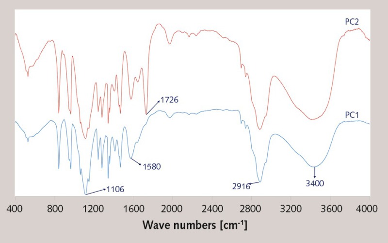 and polyoxyethylene group (-CH2-O-CH2-, 1100-1112 cm-1). FTIR spectra of PC1 and PC2 are shown in Figure 2. The peaks of aliphatic group (-CH-,