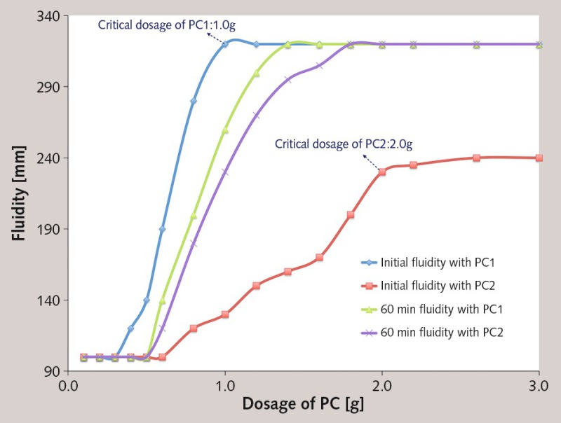 The fluidity of the cement paste with varied dosages of PC is summarized in Figure 10. With the increasing dosage of PC, the initial fluidity and the 60 min fluidity are increased. It can be seen that the fluidity with PC1 is increased more steeply than that of PC2 at the low dosage, and there is a maximum fluidity at a certain dosage. For PC1, it is about 320 mm at the dosage of 1.0 g, and that of PC2 is about 230 mm at the dosage of 2.0 g. It indicates that the initial dispersion of PC1 is much stronger than that of PC2.