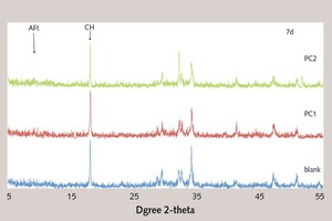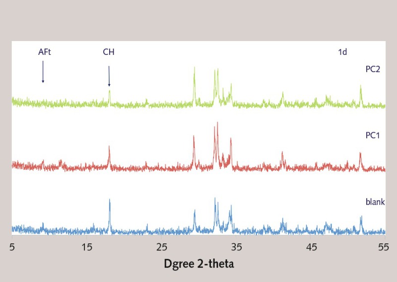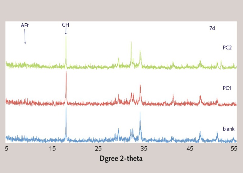 Cement paste was prepared with a water/cement weight ratio of 0.35:1. And the samples were cured in the > 90 % R.H. chamber at 20 ± 1 °C until designated ages. After 1 d or 7 d, they were treated with anhydrous alcohol in order to end their hydration, and then broken into small pieces and powder. The powder samples were tested by X-ray Diffractometer (XRD, D/Max-RB, made by Rigaku, Japan) with Cu (Kα) radiation and a current of (40 mA, 40 kV), at a speed of 4 °/min and a step of 0.02° within the range from 5 to 70°.