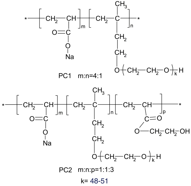 PC1 was synthesized with acrylic acid (AA) and isoprenyl polyoxyethylene (IPEG), and the molar ratio was 4:1. PC2 was synthesized with AA, hydroxyethyl acrylate (HEA) and IPEG, and the molar ratio was 1:3:1. A schematic diagram of the chemical structure of PC1 and PC2 is shown in Figure 1.