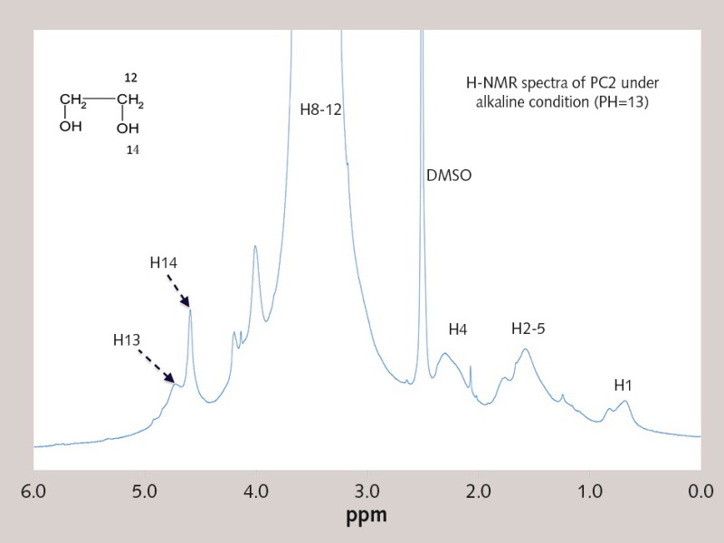 PC2 (100 g, 20 wt %) and NaOH (100 g, 0.2 g/L) were mixed together and stirred quickly, and then the pH value was tested by the pH meter. After the pH value didn’t vary at all, hydrochloric acid was used to adjust the pH value to 7.0. And then, the solution was dried in a vacuum drier at 60 °C. The solid was prepared for measurement of 1H-NMR and FTIR.