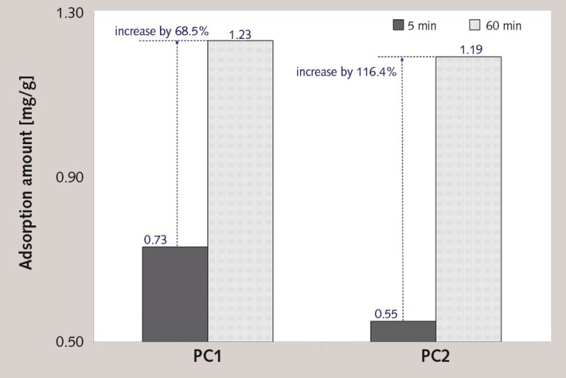 Figure 7 shows the adsorption amount of PC at 5 min and 60 min. No matter 5 min or 60 min, the adsorption amount of PC1 is larger than that of PC2. But there is a significant difference in the increase of the adsorption amount from 5 min to 60 min. The adsorption amount of PC1 is increased by 0.5 mg/g, which is 68 % of adsorption amount at 5 min. while for PC2, it is increased by 0.64 mg/g, which is 116 % of adsorption amount at 5 min. This illustrates that the increase of the adsorption amount of PC1 within 60 min is less than that of PC2, which is closely related to the decomposition of the ester group in side chain. The ester group in fresh cement paste can be decomposed to bring the carboxyl group to increase the grafting density of the carboxyl group, which can significantly improve the superficial adsorbing ability to increase the adsorption amount of PC2 within 60 min.