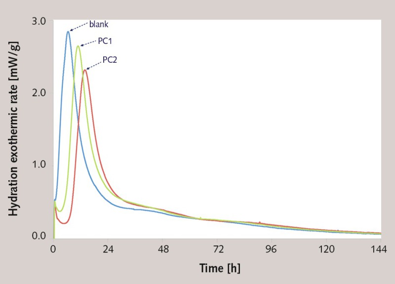 The solution with PC and cement was mixed together with a water/cement weight ratio of 0.35:1. Hydration heat of cement paste was tested by micro-calorimeter (TAM AIR, made in the USA).
