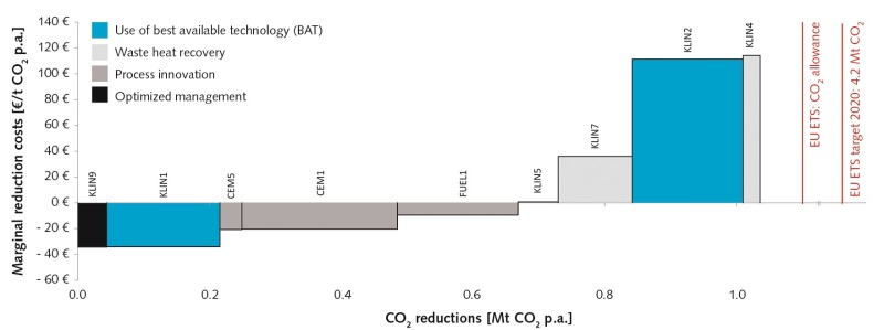 It is also impossible to achieve the objectives of EU ETS by 2020 with reductions of 4.21 million t CO2 and by 2030 with reductions of 7.7 million t CO2 with the investigated measures. The objective for 2030 would result in specific CO2 emissions of just under 0.5 t CO2/t clinker, and would be below the objective of the World Business Council for Sustainable Development of 0.56 t CO2/t clinker by 2030 (cf. WBCSD and IEA 2009).