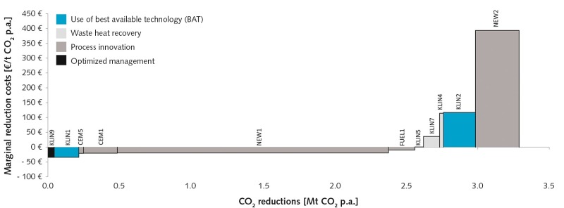 On the plant level, future measures (NEW1 and NEW2) are not taken into account for evaluation of the economic savings potential (Fig. 13). Due to the precedence of more cost-effective measures, a change in the order of marginal costs also takes place, as in the examples of KLIN2 and KLIN4. The economic CO2 reduction potential in the basic scenario thus amounts to 0.67 million t of CO2 p.a., which approximately makes up 3.4 % of the CO2 emissions in 2010. At the assumed prices, the economic measures would lead to an annual saving of € 14 million. On the basis of an average CO2 emission rate of 0.81 t CO2/t clinker, an additional 1.09 million t of CO2 would have to be saved in order to enable the achievement of the CO2 exemption level of 0.766 t CO2/t clinker – equally distributed over all German plants. This cannot be achieved with the investigated measures.