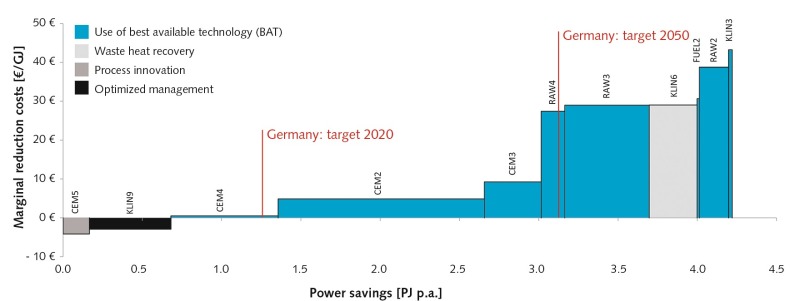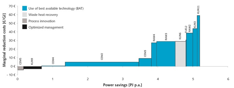 The upshot is that the subject of “energy efficiency” – whether for political or economic reasons – will move more and more into the focus of German industrial companies. Against this background, the potential for reducing power consumption in the German cement industry was examined on the basis of energy-saving measures described in the literature by individually considering the existing German plants. For the purpose of discussion, marginal cost curves for energy saving were created, as these depict both the effectiveness of individual measures and the overall savings potential within an economic framework. The curves serve to visualize the economic savings potential, on the one hand, while, on the other hand, allowing the costs for compliance with political stipulations to be derived. As the last step, the dynamics of potential economic energy-savings were investigated with regard to varying CO2 and energy prices and conclusions were drawn with respect to their consequences for the average energy-related production costs of the German cement industry in the period 2013 to 2035.