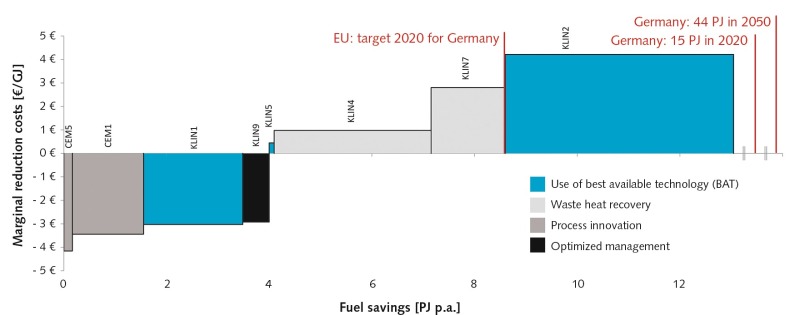Following the described method on the plant level (section 2.1), the adopted solution in the case of competing measures is to implement the measure with which the highest capital value can be achieved. This inevitably leads to a reduction in the savings potential and an improvement in the cost effectiveness of the measures. Nevertheless, the prices assumed for the basic scenario do not suffice to push measures that promise large savings, such as KLIN4 or KLIN2 into the cost-effective range. The total savings potential is, after all, achieved via the x-axis, with the point of intersection representing the economic fuel savings potential of 4.00 PJ p.a. or 5.2 % of the fuel requirement in the year 2010 (cf. Fig. 9). Through the area of the measures to the left of the point of intersection, annual cost savings amounting to € 12.8 million can be calculated for the entire cement industry. Considering the political objectives, the EU Energy Efficiency Directive specifies annual savings of 1.5 % between 2014 and 2020. Related to the fuel consumption of the cement industry, this means a reduction of 7.15 PJ per year. In comparison to the economic savings potential, the measures KLIN5 and KLIN4 must be additionally implemented, which would involve an additional cost burden of just under € 3 million p.a. The energy concept of the German Federal Government has set ambitious targets and demands, as a first step, that up to the year 2020 the primary energy consumption must be reduced by 20 % compared to the 2008 figure.