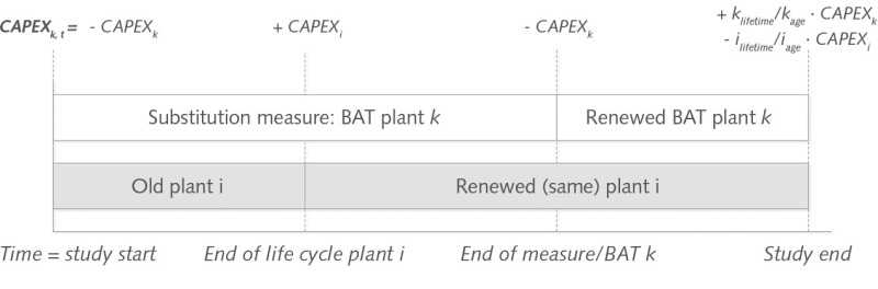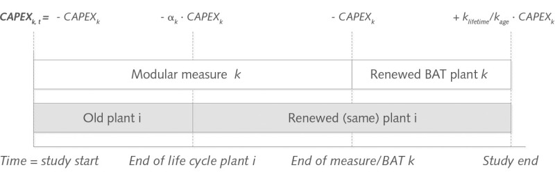 In the case of capital costs, a distinction is made between the replacement of a plant with best available technologies (BAT) or modification by equipment retrofitting. In the first case, the costs for keeping the existing plant (e.g. higher maintenance costs, modernization, new linings) are set off against the capital costs for BAT (Fig. 5).