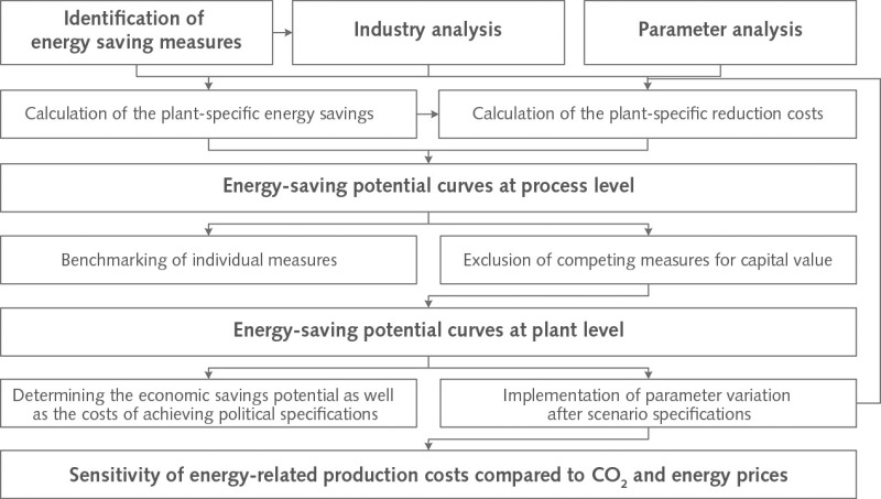 The smallest system boundary in this investigation is the process level (Fig. 1). This is where the respective educts and products are balanced per process stage, and the consequences of energy saving measures are evaluated to this balance. This perspective enables a comparison of the effectiveness of measures with regard to their costs and energy-saving effect. However, it has to be taken into account that the sum of the individual considerations on the process level does not necessarily reflect the situation in the plant as a whole. In particular, insufficient account is taken of measures that – for instance – are associated with different processes, but are intended to share the same waste heat. In order to take account of this competition between measures, and thus be able to reach conclusions about the total savings potential of a plant, the system boundary has to be extended to the complete plant (Fig. 1). To reach this system boundary, competing measures have to be excluded according to defined criteria (section 2.3.1), and this inevitably results in a reduction of the energy-saving potential compared to the process level.