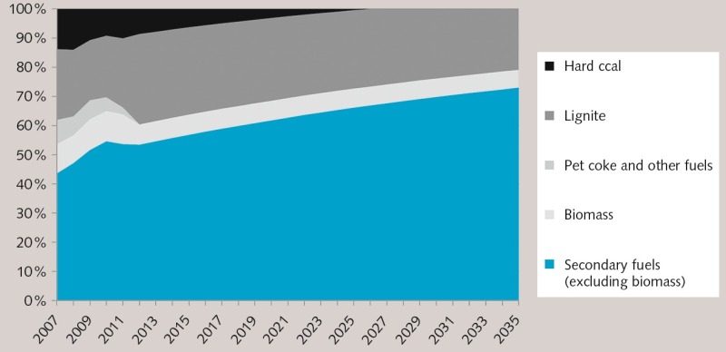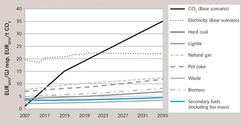 The use of secondary fuels (SF) is a special case, because of their composition is made up of energy sources and waste materials. For several reasons, this investigation distinguished between biomass and non-biomass constituents (Fig. 3). For one thing, there is increasing competition for the use of biomass, and it can be assumed that although the total proportion of SF in the overall fuel mixture will increase, the available absolute quantity of biomass will remain constant in the future. Furthermore, it is important to distinguish between biomass and non-biomass because of the CO2 costs. EC regulations (2012) classify biomass, which fulfills the sustainability criteria, as emission-free in the sense of European emission trading (EU ETS), which offers an additional cost benefit for plant owners.