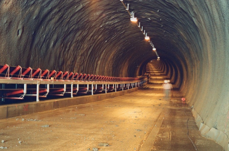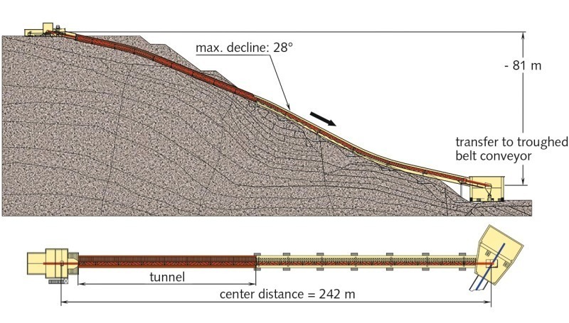 Further basic requirements taken into consideration while realizing the project, were both a high reliability of the total system at greatly varying operation conditions and the use of the energy produced by the operation of the descending continuous conveying system. As Figure 1 shows, Beumer met these requirements by combining a tubular belt conveyor in the first section of the transport route with a troughed belt conveyor with horizontal curves in the section running through the tunnel. The use of a tubular belt conveyor makes it possible to handle a conveying capacity of up to 1400 t/h, even when declining up to 28 degrees. This closed conveying system is especially suited for this kind of descending conveying lines. The downstream troughed belt conveyor adapts ideally to the tunnel wall on the whole conveying route and therefore is the optimal solution in combination with the travel and service track within the tunnel (Fig. 2).