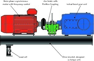 These drive units shown in Figure 13 consist of a three-phase asynchronous motor with frequency control, a shaft-mounted helical bevel gear unit and a disc brake on the input side of the gear unit. The drive platforms are supported by a load cell used to determine the drive torque. Besides its function as a mere holding brake, the disc brake is also used for stopping the system in emergency situations, e.g. in case of a power failure.