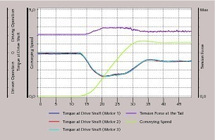 The circumferential forces mainly depend on the drive power demand during stationary operation of the conveyor, which again is influenced decisively by the load distribution along the conveyor. Therefore, a drive strategy had to be used which takes the system length, the belt tensioning system, and the routing of the system into account. The start-up and shut-down program [6], developed by Beumer especially for these cases of application, ensures that the required torque is always produced according to a set curve depending on the operating condition, and that the transitions to the stationary operation are always smooth without abrupt alterations. By these measures, the additional dynamic stress on the belt could be reduced to a minimum.