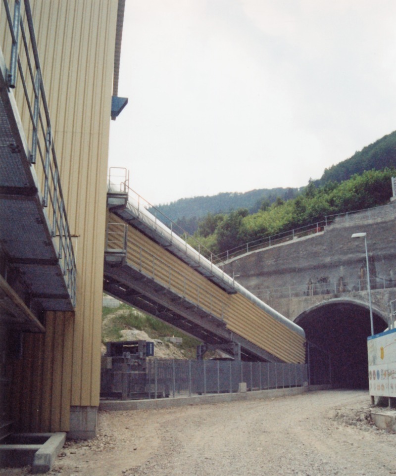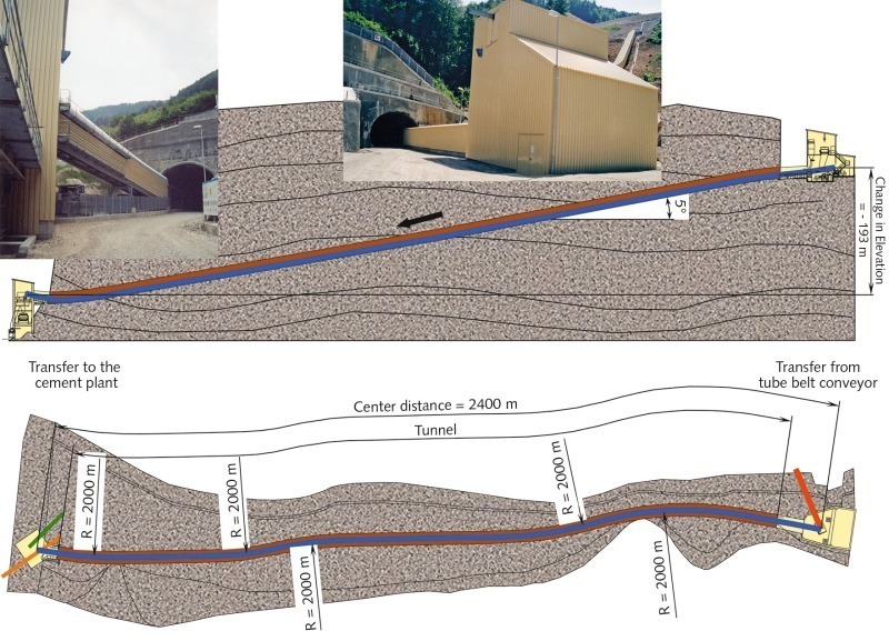 As shown in Figure 1 the crusher in the quarry was to be linked by a conveying system to the cement plant situated downhill. During transport a difference in height of 280 m in total at an inclination of up to 28 degrees had to be overcome. Right from the beginning the goal was to minimize, as far as possible, the number of conveyors and thus the number of transfer stations. Furthermore, a tunnel designed for limestone transport by truck was to be used as the route for the conveying system to be constructed.