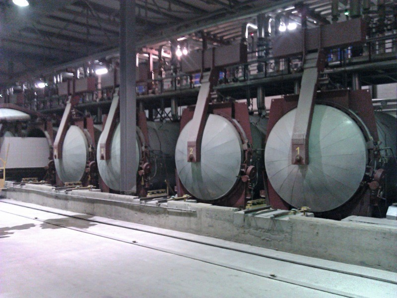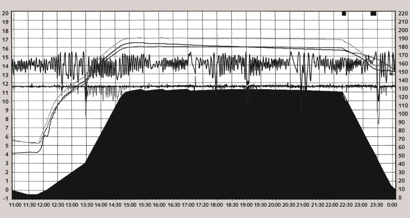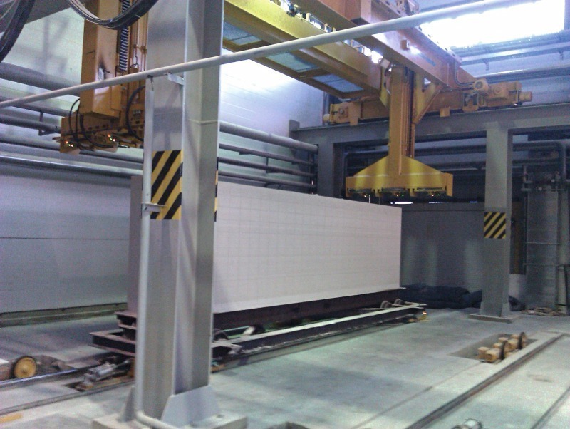 During the autoclaving of the aerated concrete products with densities of D 400 and 500 the steam pressure rises by 0.025-0.03 MPa after the operating point has been reached. This then triggers the automatic control system for the steam pressure in the autoclave and switches off the steam supply so that after a few minutes the pressure falls back to the set value of 1.1 MPa. The pressure in the autoclave then rises until the automatic control system is actuated again.