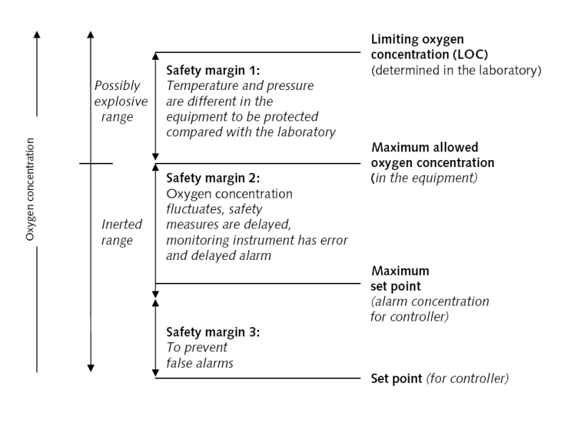 The detection of smouldering fires will be carried out mainly with CO and CH4 analyser systems. Historically, oxygen-measuring instruments were not used in practicable silo plants which supervise and guarantee the inerting procedure. According to the guidelines (e.g. TRBS 2152, VDI 2263, CEN 15281) it is necessary in dangerous situations to maintain and supervise the limiting oxygen concentration (LOC) for different fuels. One method for application of monitoring and control systems is shown in Figure 2.