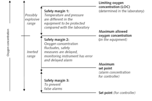 The control unit (RSC) compares the signals of the temperature sensors (digital values and analog values) of the process with the given security concept. With the help of the measured gas components and temperatures the controller generates special behaviour conditions, which are based on the limiting oxygen concentration (LOC), which is given by the explosion protection concept. If the temperature is changing in the system the LOC will be automatically adapted and the alarm values will be changed accordingly.
