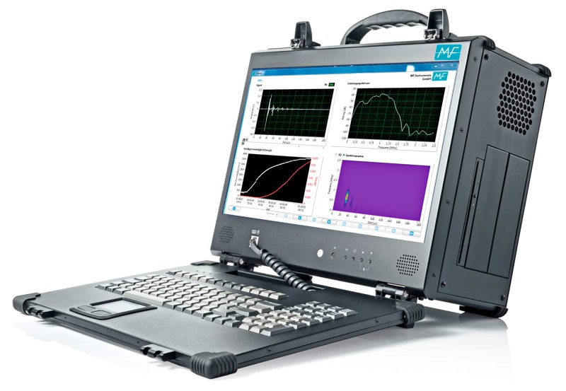 A measuring system for the characterisation of inorganic binder systems that uses the transmission method to measure the acoustic velocity of longitudinal waves in a specimen and the transmitted/received energy is described in [1]. The measuring cell consists of two brackets bearing the transmitter and receiver, and a specimen holder. In addition to the transmitter/receiver and the specimen, the acoustic path includes the contact chambers, which are filled with the couplant, and are separated from the specimen by a dividing film or layer. The transmitter is connected to the pulser and the receiver to the signal analyser.