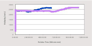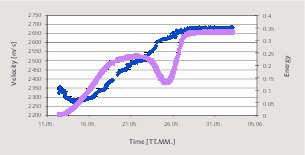 Not only the spectra, however, but also the integral energy/energy curve or trend is of informational value. The energy curve correlates in general to the inception of strength gain with the rheometric results, Vicat tests and isothermal calorimetry [2]. Analysis of the energy curve, including acoustic velocity, demonstrated that volume shrinkage occurs in the early stages of gypsum dehydration [1]. This was also confirmed in [3] using conventional means. The tests performed in [1] lasted up to 60 hours, with energy rising ever further. The question thus arose of how energy and acoustic velocity behave over a longer period.
