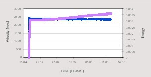 Intensive drying of the specimen commences, inter alia, from this time onward, and energy reaches its second maximum. The second minimum and a further rise then occur in succession, and energy and velocity appear to reach their constants (Figure 4). This part of the plot is shown separately to improve clarity. The continuing duration of the test then equates to the x value read off from Figure 4 plus 597 hours 25 minutes.