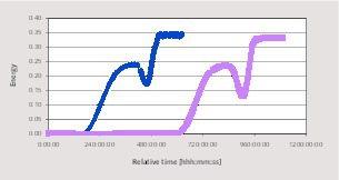 Figure 1 illustrates by way of example the inception of strength gain. Energy is shown as a dimensionless quantity. The energy emitted by the transmitter applies as the reference value for it; the Y values represent the portion transmitted by the gypsum. Here, and in all other figures with the exception of Figure 5 the absolute time is plotted on the X axis, with the point ‘17.04.2015 12:47:29’ representing zero time. The figures show the raw (unprocessed) data.