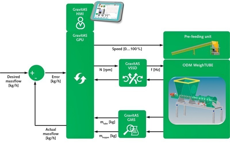 A diagram, which shows the relationship between the mechanical platform of the ODM-WeighTUBE® and the ODM-GravitAS control system, is visualized in Figure 2. The mechanical platform consists of a feed hopper, which acts as a material buffer and dosing device, a variable speed screw for discharging and dosing of the material and a measuring tube, where the actual material weight is provided by a set of load cells. The innovative mechanical design provides a maximum insensitivity against harmful impurities and allows easy maintenance within compact dimensions (see also [2]).