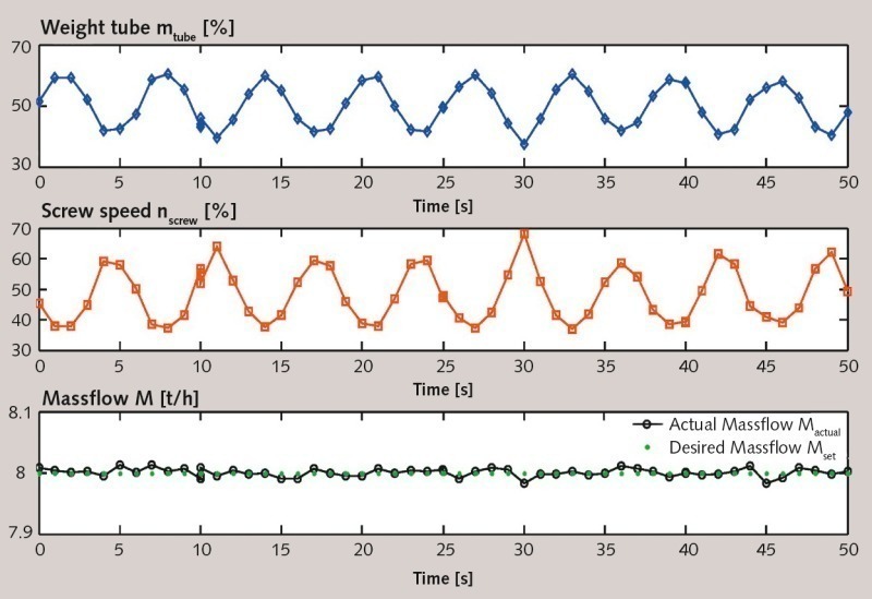 The continuous dosing controller of the GravitAS control system is responsible for the screw speed adaption based on the actual tube weight. Here, an inverse relationship between measured weight and actual screw speed leads to a continuous, stable and constant mass flow, as shown in Figure 3. The controller itself is based on a classical discrete PID-control structure, but contains certain interfaces to an additional online calibration routine, which is responsible for a continuous auto-tuning of the controller parameters.