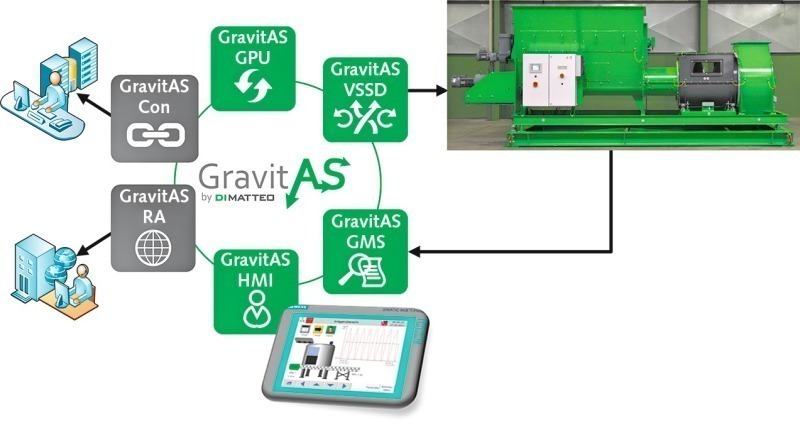 As optional modules, the GravitAS CON contains all necessary elements for a field bus driven signal exchange (e.g. Profibus, EtherCAT, DeviceNet, etc.), while GravitAS RA allows a GSM or Ethernet based remote access and maintenance. All these elements are combined within an electrical cabinet, which is tailor-made for every new customer.