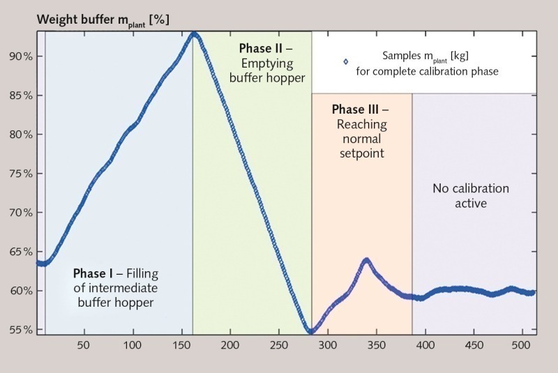 During the automatic calibration routine the intermediate buffer hopper of the ODM-WeighTUBE®, whose total weight is also measured by load cells, is filled to a certain maximum in a first stage of operation. Within the second phase the buffer hopper is emptied by normal dosing operation (and parallel feed of material to the buffer is stopped) up to a predefined minimum buffer weight. From the resulting difference in mass (m) and the corresponding expired time (t), the actual control parameters of the continuous dosing controller are automatically adapted. To avoid possible undesired influences, all controller parameters are checked for plausibility based on a probabilistic analysis of former calibration cycles, before they become active in the system. A typical calibration process, with its three phases, is shown in Figure 5, where the actual buffer weight mplant [kg] is visualised over time.