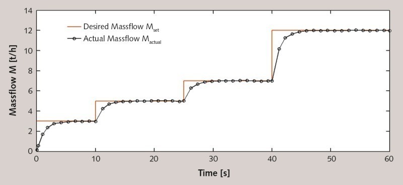 The controller parameters can be set during the commissioning of the system in order to meet the desired process behavior defined by the specialists in the plant, where e.g. a highly dynamic variation of the throughput without any overshooting behavior can be achieved, as shown in Figure 4.