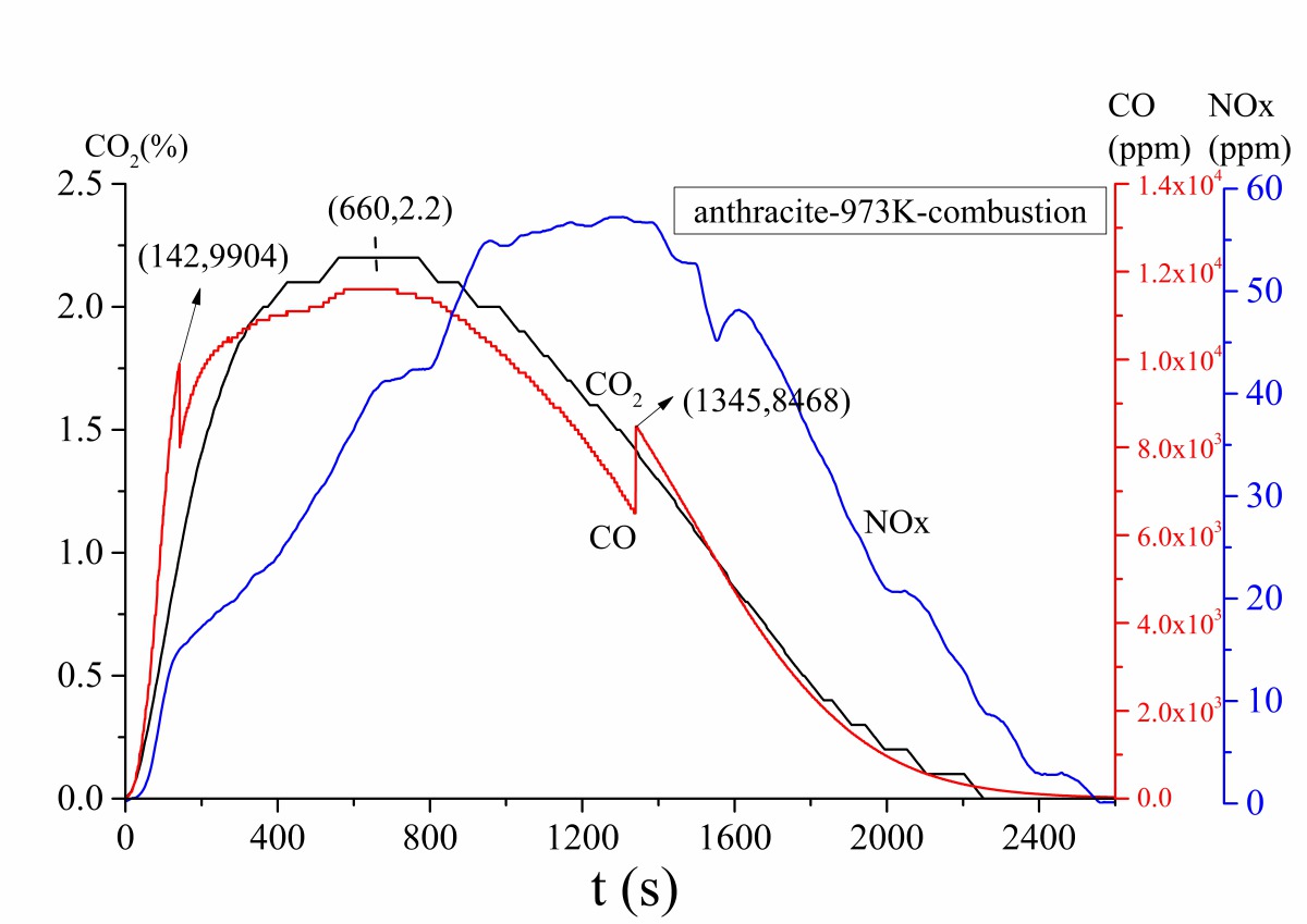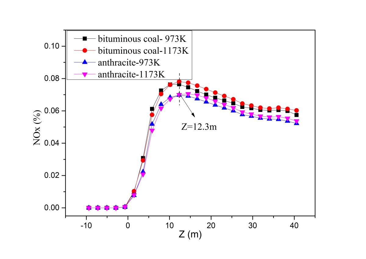 (6) The high temperature was seen to promote NOx formation. For coals of equal mass, much more NOx formed during anthracite combustion as compared to bituminous coal, despite the fact that the NOx concentration maximum for bituminous coal combustion was higher.