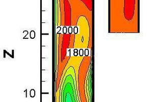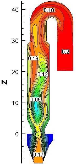 and 10b, it was found that the CO concentration in the middle part was higher, while the CO2 concentration was lower there. This is because the CO2 came from char combustion and the CO had been oxidized. In the middle part of the precalciner, the O2 concentration was lower, and less CO was oxidized, so the CO2 concentration was lower there. As to be seen in Figure 10c, the fuel NOx distribution was similar to the CO distribution, but the high NOx concentration zone came later than the high CO concentration zone, documenting that the NOx formation reaction was less readily achieved than the CO formation reaction. According to Figure 10d, at -9.8 m < Z < -0.7 m, the average temperature decreased gradually, because the temperature of the flue gas was higher than the temperature of the tertiary air. In the main part of the precalciner, the average temperature increased gradually with the burning of pulverized coal. A low-temperature zone located at Z = 0 m resulted from pulverized coal being injected into that part of the precalciner, and the pulverized coal having absorbed the heat from the gas flow.