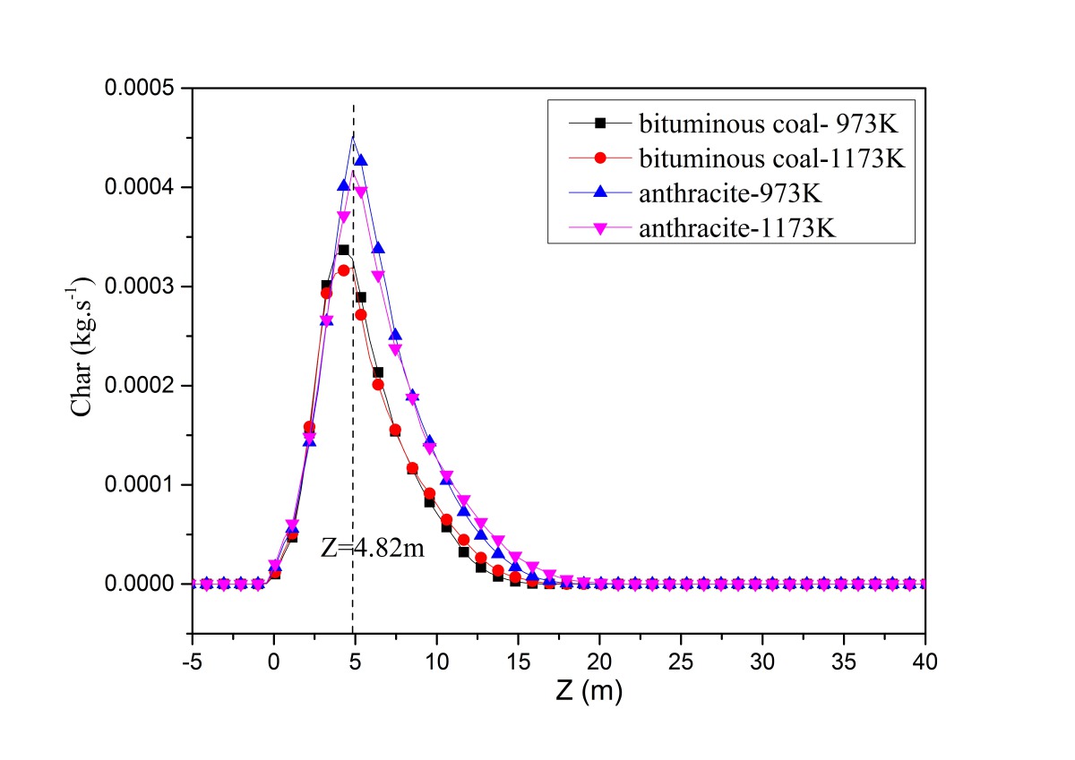 (4) The numerical simulation results showed that, when the tertiary air temperature was 1173 K, the CO formation yield and char NOx formation yield were much higher than at 973 K.