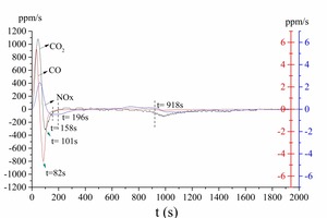 As shown in Figure 2a, the bituminous coal combustion product was mainly CO2, and the release peak was 4.98 %. The amount of CO and NOx were relatively low, with peaks situated at 198 ppm and 136 ppm, respectively. According to Figure 2a and 2b, the bituminous coal combustion process can be classified into four stages. The first stage was the early combustion (0 s < t < 82 s), which included the volatile release and combustion process. At this stage, the CO, CO2 and NOx generated gradually, and their release peaks formed gradually. According to Figure 3, the release peaks derived from the initial pyrolysis products. Among them, the CO released rapidly and formed a release peak (t = 60 s). The CO peak was the sharpest, showing that the CO formation reaction was the fastest. The CO2 release start point was later than the CO curve, and the CO2 peak also formed later and was wider than CO peak. The NOx release start point was the latest, and the formation rate was the slowest, demonstrating that the NOx formation reaction was the slowest. The second stage was the char ignition combustion stage (82 s < t < 196 s). In this stage, the CO concentration decreased continually (Figure 2a), but the absolute value of the CO release rate continued to increase, because part of char began to burn and form CO at this stage, hence keeping the CO concentration from decreasing. At this stage, CO2 formation began at t = 101 s, which was later than the time needed for CO formation (t = 82 s). NOx formation continued from 82 s < t < 111 s, which shows that the volatile NOx formation reaction was less readily achieved than the CO and CO2 formation reactions. At 111 s < t < 158 s, the NOx formation rate decreased gradually. After that, i.e. between 158 s < t < 196 s, the NOx formation rate remained stable. The third stage was the char stable combustion stage (196 s < t < 918 s). In this stage, the CO formation concentration was very low, the average concentration being about 18 ppm. There was a small peak at t = 918 s on the CO formation curve. This may have been caused by materials pyrolysis, as shown in Figure 3. The CO2 formation rate remained stable, and there was a small CO2 formation peak at t = 491 s. The char NOx began to generate after t = 491 s. The fourth stage was the later char combustion stage (t > 918 s). In this stage, both CO and CO2 concentration decreased rapidly, NOx concentration decreased relatively late (t > 956 s). The CO formation reaction ceased at t = 1421 s, the CO2 formation reaction at t = 1681 s, and the NOx formation reaction at t = 1900 s (Figure 2a). During the entire combustion process, CO formed more readily than CO2 and NOx.