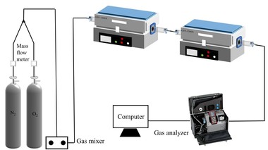 In a precalciner, the average temperature is about 1170 K when the exothermic reaction of coal combustion and the endothermic reaction of CaCO3 decomposition reach the state of thermodynamic equilibrium. At the CaCO3 inlets, the average temperature is lower. With increasing scarcity of energy resources, the use of coal in the cement industry is gradually shifting from bituminous coal to anthracite. Hence, it is urgently necessary to compare the combustion characteristics of bituminous coal and anthracite in the temperature environment of a precalciner. Previous scholars investigated the coal combustion process mainly by drop-tube furnace and thermogravimetric analysis [16-22]. The drop-tube furnace experiment can model the gas-solid reactions in the precalciner. However, because of the coupling effect of many factors, it is hard to deduce the exact mechanism of fuel N migration. Thermogravimetric analysis can reflect the dynamic characteristics of coal combustion, but it cannot heat rapidly. A horizontal fixed-bed reactor can model the temperature and O2 concentration in the precalciner and reflect the gas release rules both qualitatively and quantitatively. Some scholars who have performed studies based on a horizontal fixed-bed reactor focused mainly on the NOx emissions and ignored the interaction between different gas components [23-24]. Moreover, their experiment condition differs markedly from the precalciner condition.