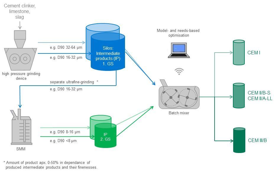 Because of growing challenges in comminution technology with respect to rising product finenesses, controllable particle size distributions and higher energy efficiency, the current trend of research work is towards proportionate ultra-fine grinding of the cement main constituents using stirred media mills (SMMs). The “separate ultra-fine grinding” process utilizes high energy efficient pre-comminution stages, such as high-pressure comminution devices (1st grinding stage), in which several different intermediate products are pre-ground to different finenesses. A small proportion of the finest intermediate product from the 1st grinding stage is then ground separately to very high finenesses by SMMs (2nd grinding stage), so that – at the end – there is a pool of different intermediate products with varying finenesses for mixing cements (Figure 1) [1, 2, 3].