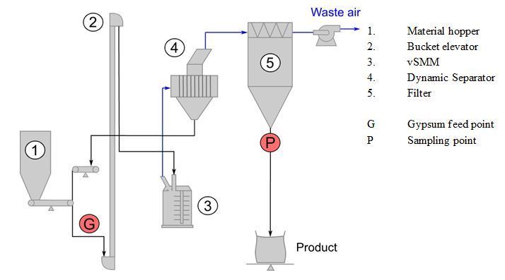 The sampling (see point P in Figure 2) was carried out at pre-defined time intervals, starting at the same time as the start of the FGD gypsum feed. With the samples that were obtained it was possible to determine the progress over time of the gypsum concentration in the product from the start of addition until the plant was stabilized. The phase composition (gypsum – hemihydrate) in the product was also determined. Through the progress of the gypsum concentration over time it is possible to obtain information about the residence time of the sulfate particles in the plant but the levels of the different calcium sulfate phases provide an indication of the degree of gypsum dehydration within the vSMM.