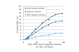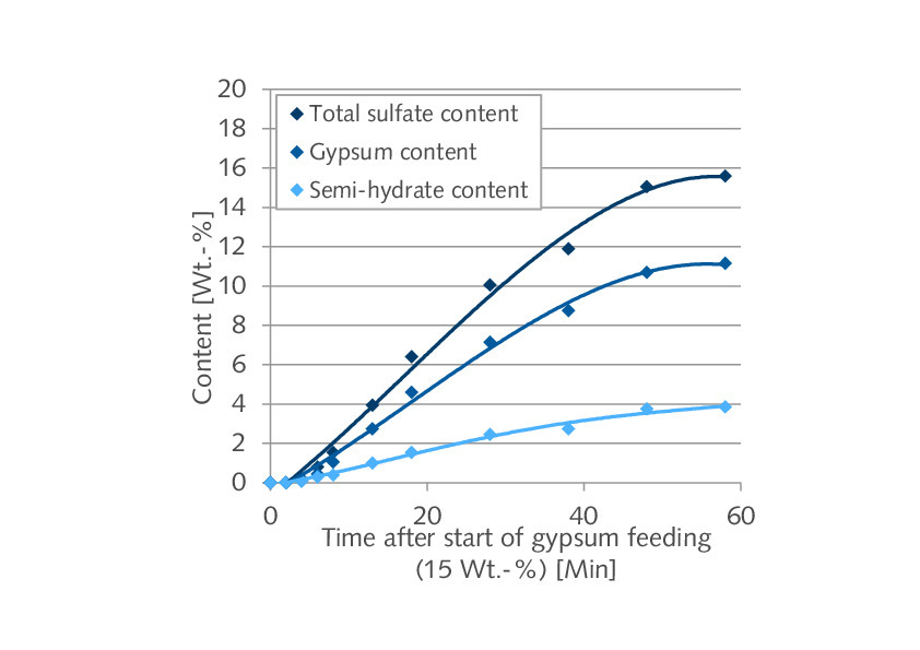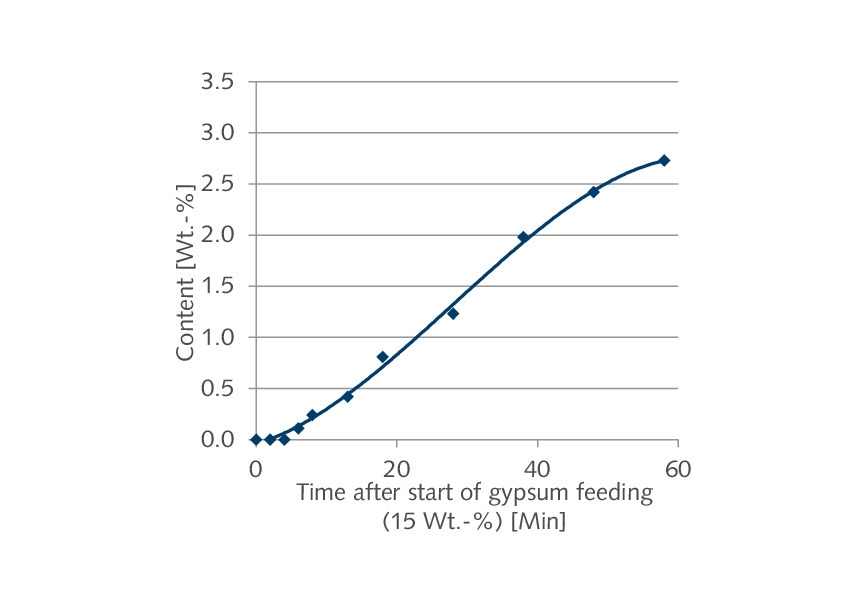 The FGD gypsum contains crystal water, so the water content also rises with the increasing quantity of gypsum in the product. The water content of the samples that had been taken was therefore determined after appropriate homogenization. An analyzer from Eltra (CW Multiphase) was used for this purpose. The results are shown in graphical form in Figure 3 (left).