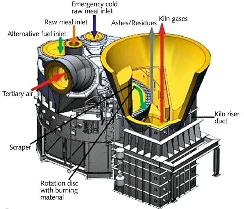 The heat content of the alternative fuels is used for calcination. By providing extra residence time for the fuel, volatile circulation and blockages at the kiln inlet are minimised. Alternative solid fuels are introduced onto the slowly rotating disc, where they start to burn in fully oxidizing conditions when meeting the hot tertiary air. Fuel residence time can be optimised simply by adjusting the disc’s rotational speed. Operation is also controlled by regulating raw meal feed to the HOTDISCTM. The burning fuel is transported approximately 270 ° on the disc until it reaches the scraper, where the remaining ash and partly calcined materials are discharged into the riser duct. Heavy combustion residues fall down into the kiln inlet, while the lighter fractions and the combustion gases move upwards into the calciner. The heat content of the alternative fuels is used for calcination.