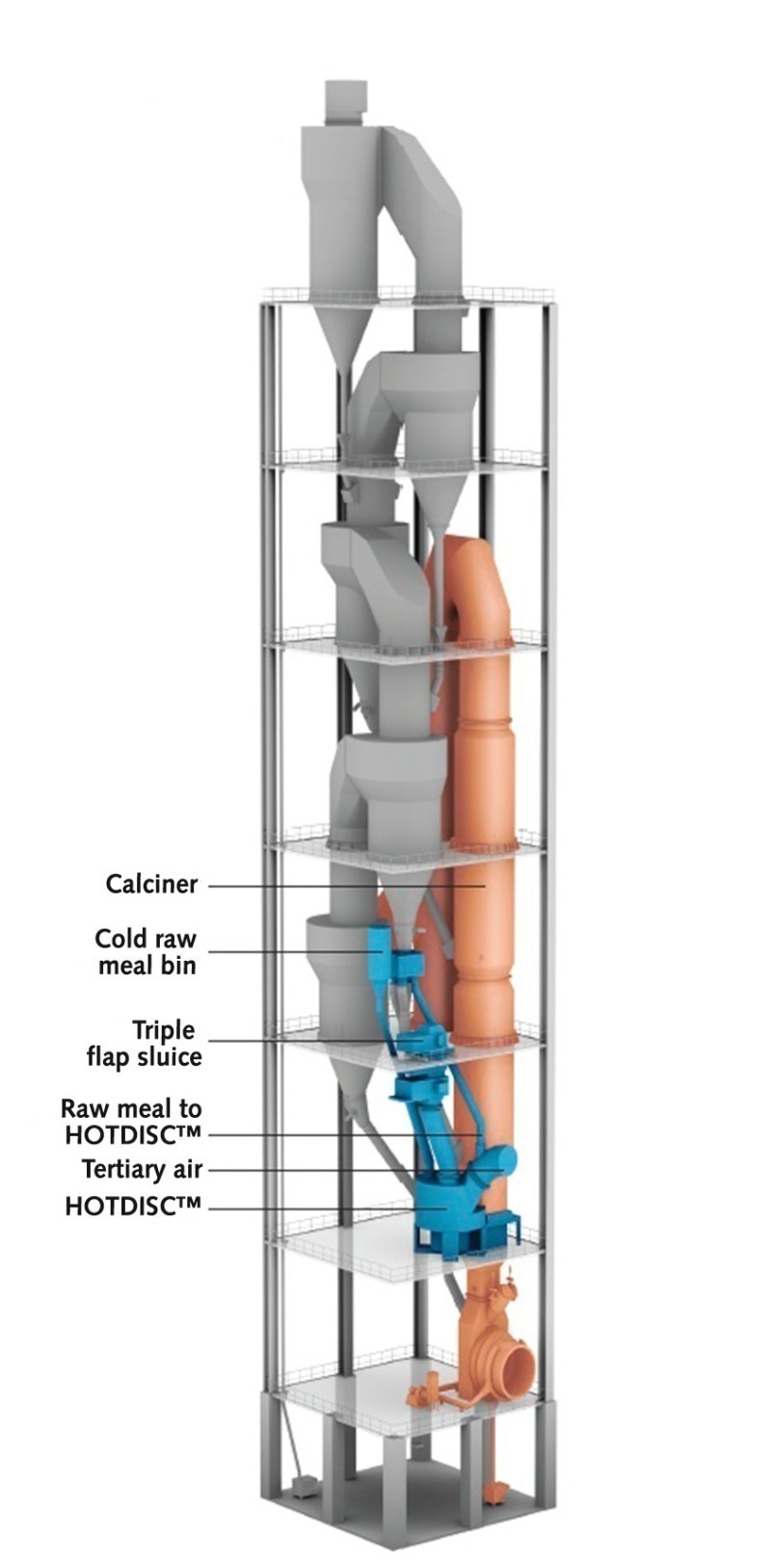 The HOTDISCTM’s use of clinker cooler tertiary air and preheated raw meal, along with alternative fuel, ensures complete energy efficiency. This results in stable production capacity and minimum fuel and power consumption from the pyrosystem.
