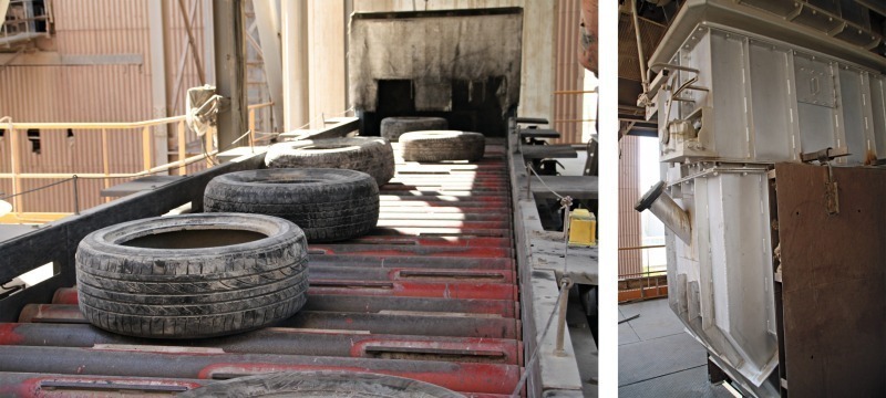 The kiln is an FLSmidth Rotex kiln (55 m length, 5 m diameter) with a capacity of 4000 t/d (Fig. 3). Coal is fed as the main fuel to the preheater and main burner. The preheater has an in-line calciner and is a four-stage, single-string cyclone preheater. At the transfer point to the kiln system, a properly designed quench mixing chamber (Fig. 4) is critical for the highest performance efficiency and minimum interference to stable kiln operation. This quenching chamber has traditionally only been used in regions where the local raw materials are naturally high in chloride, sulphur or alkalis. FLSmidth has developed this type of chamber through a number of innovative design features. At NCC, for the first time an updated design of an FLSmidth quenching chamber has been used very successfully. Also, NCC has used as alternative fuels, used car tyres (Fig. 5), which are fed to the kiln inlet (full piece) by weighing system and double flap gate directly to the inlet kiln at the riser area. The clinker is cooled in a cooler type SF designed and supplied by FLSmidth.