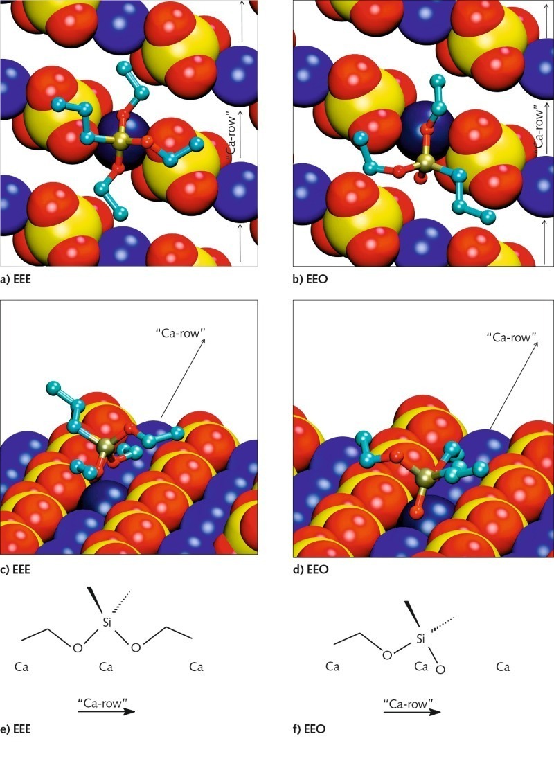 The energetically most favorable conformations of the adsorbed monomeric silanes at the gypsum surface are demonstrated in Figure 7 for the examples of propyltriethoxysilan (EEE) and propyldialkoxysilanol (EEO). The conformations of different silane molecules have some common aspects. There are calcium ion rows between sulfate ion rows along the (020) gypsum surface. The silicon atom in the silane molecule is tetrahedrally coordinated. The interaction between silane and surface is governed by the oxygen atoms of the silane, coordinating the calcium ions of the surface. Two of the three ethoxy groups of the silane are oriented towards the surface along the calcium ion channel, coordinating the same calcium ion (marked in darker blue in Fig. 7).The third ethoxy group and the propyl group are oriented away from the gypsum surface.