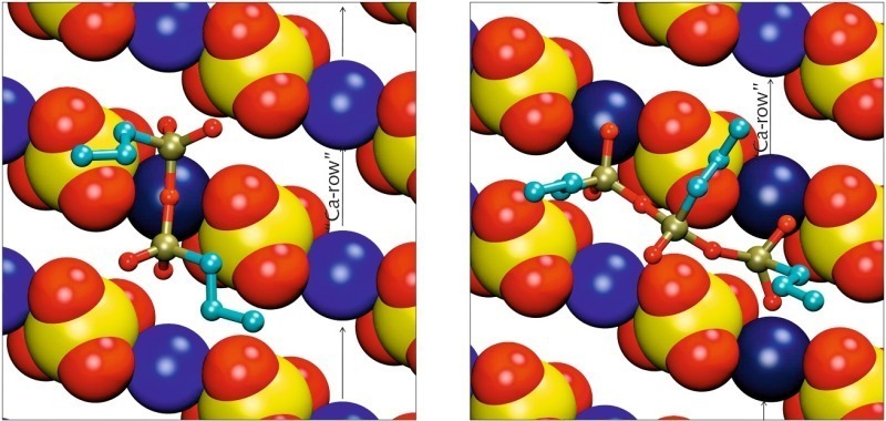 For the dimeric and trimeric form of PTES the situation is shown in Figure 8. For sterical reasons the dimer can only adsorb with two of its four terminating free oxygens. The other two free oxygens as well as the bridging oxygen between the two silicon atoms are oriented away from the surface. While the dimeric silane is aligned along the calcium channel similar to the monomeric silanes, the trimeric form coordinates calcium ions in two neighboring channels. The two terminating silicon atoms adsorb via two free oxygen atoms each, the central silicon atom together with its free oxygen is oriented away from the surface, bridging the sulfate channel between the two calcium channels.