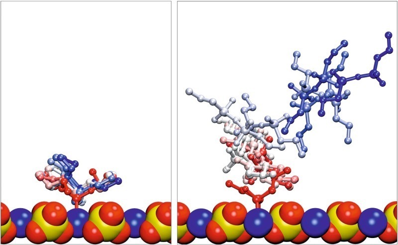 To get the most favorable positions and conformations of the silane molecules on the gypsum surface without any assumptions, the silane molecule under investigation was placed at random position and conformation in the vacuum slab above the surface and allowed to equilibrate for 100 picoseconds (ps). This procedure was repeated 50 times for every silane species. These simulations had to be carried out without solvent, because water molecules form a strong hydration layer on the gypsum surface, so that the adsorption of a molecule from free solution onto the surface is strongly kinetically hindered. That makes the simulation of the adsorption process in the presence of water impractical regarding the necessary simulation time. Without solvent the silane molecules reach the surface within a few ps. The obtained conformations of the adsorbed silanes on the surface were compared and the energetically most favorable ones were chosen as starting conformations for further simulations.