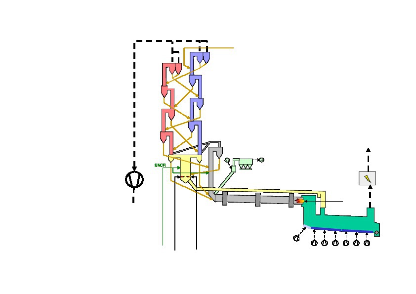 Beside the calciner installation the focus was also on improving the efficiency of the preheater system especially for dust losses at the top stage. This was done by modifications of the top stage cyclones itself as well as the change of the “Pasec” meal introduction from a single introduction point of 100 % of the raw meal to one of the two strings to a splitted inlet to both top stages. Already this reduced the top stage losses about 50 % as only 100 % of the raw meal has to pass both top stages instead of 200 %. Subsequently also the meal routing to cyclone stages 2 were adapted. For better understanding the flowsheet before (Figure 1) and after modification (Figure 8) can be compared.
