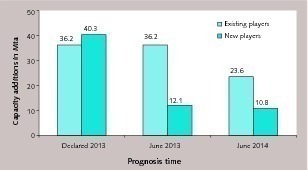 There are a number of sources such as Semen Indonesia, who provide estimates about the additional cement capacity in Indonesia in the coming years. In 2013 the prognosis was that the cement capacity could almost double between 2013 and 2017 (Fig. 14). The existing players announced 36.2 Mta, while 40.3 Mta were announced by newcomers, including the Ganda Group. In June 2013 Semen Indonesia reduced their forecast of the newcomer’s cement capacity to only 12.1 Mta. This was further reduced to 10.8 Mta by June 2014. With the decline in the demand for cement and the decline in growth rates from more than 10 % to 6 % the forecast for additional cement production facilities for existing players by June 2014 was reduced to 23.6 Mta. In total from 2013 to 2017 34.4 Mta of new cement capacity will be installed, which is 56 % of the existing capacity.